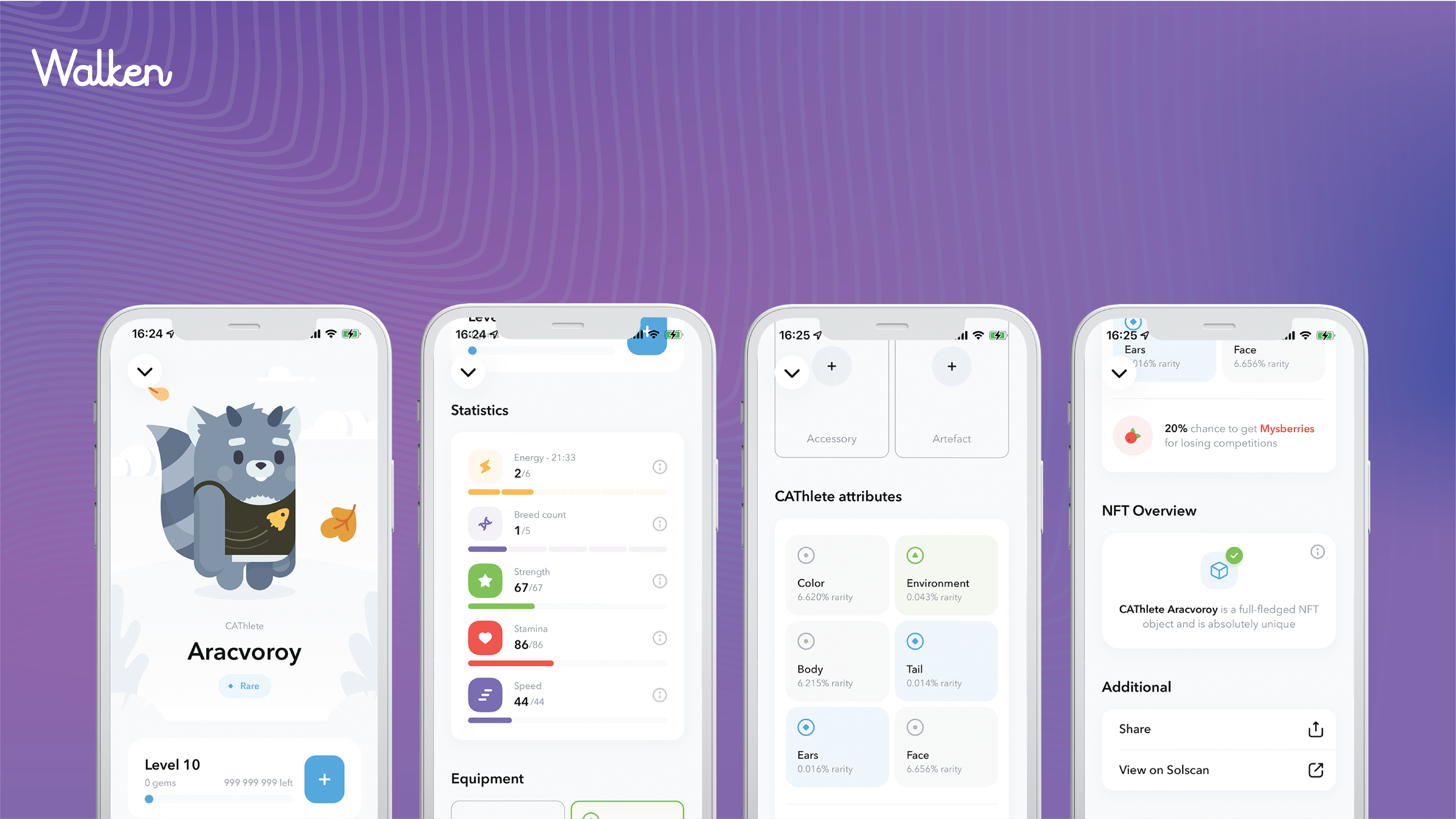 A **CAThlete** is an *in-game character* that takes part in competitions, can be upgraded and crossbred. The word comes from *‘cat’ + ‘athlete’*, hinting on both their appearance and running skills. Each CAThlete is generated with a unique set of **genes** that determine their ***appearance, stats, and rarity***. The values of the stats significantly affect the chance to win in a particular running discipline.