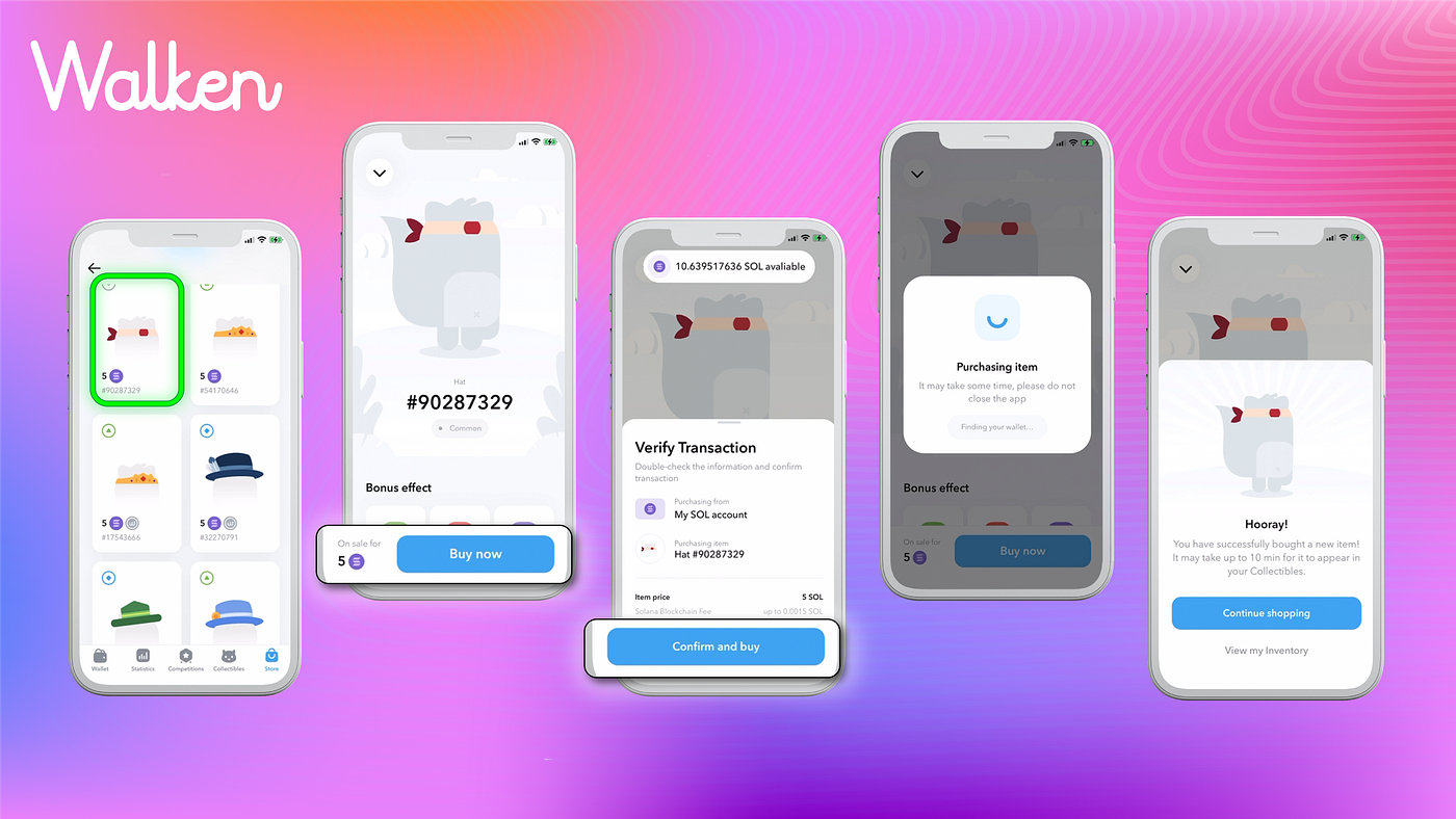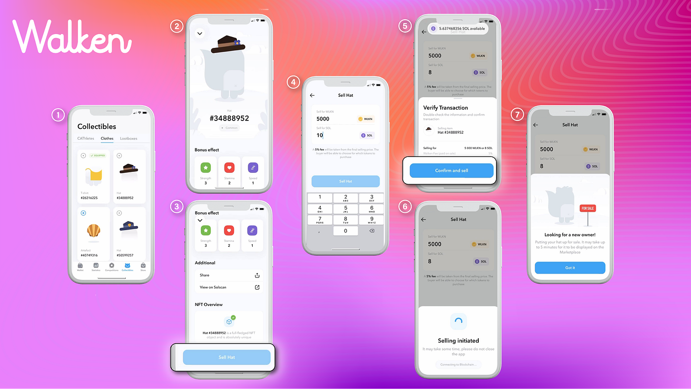 You may buy or sell NFTs for SOL and $WLKN token, so double-check the price for which you are selling the CAThlete\Item. If you make a mistake and NFTs are immediately bought, it will be impossible to cancel the action or refund the payment.