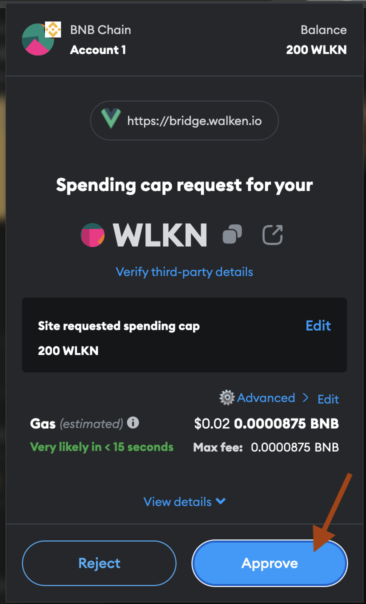 2\) Press the 'Approve' button to approve the upcoming token transfer. Please refer to this article for further info on token allowances: