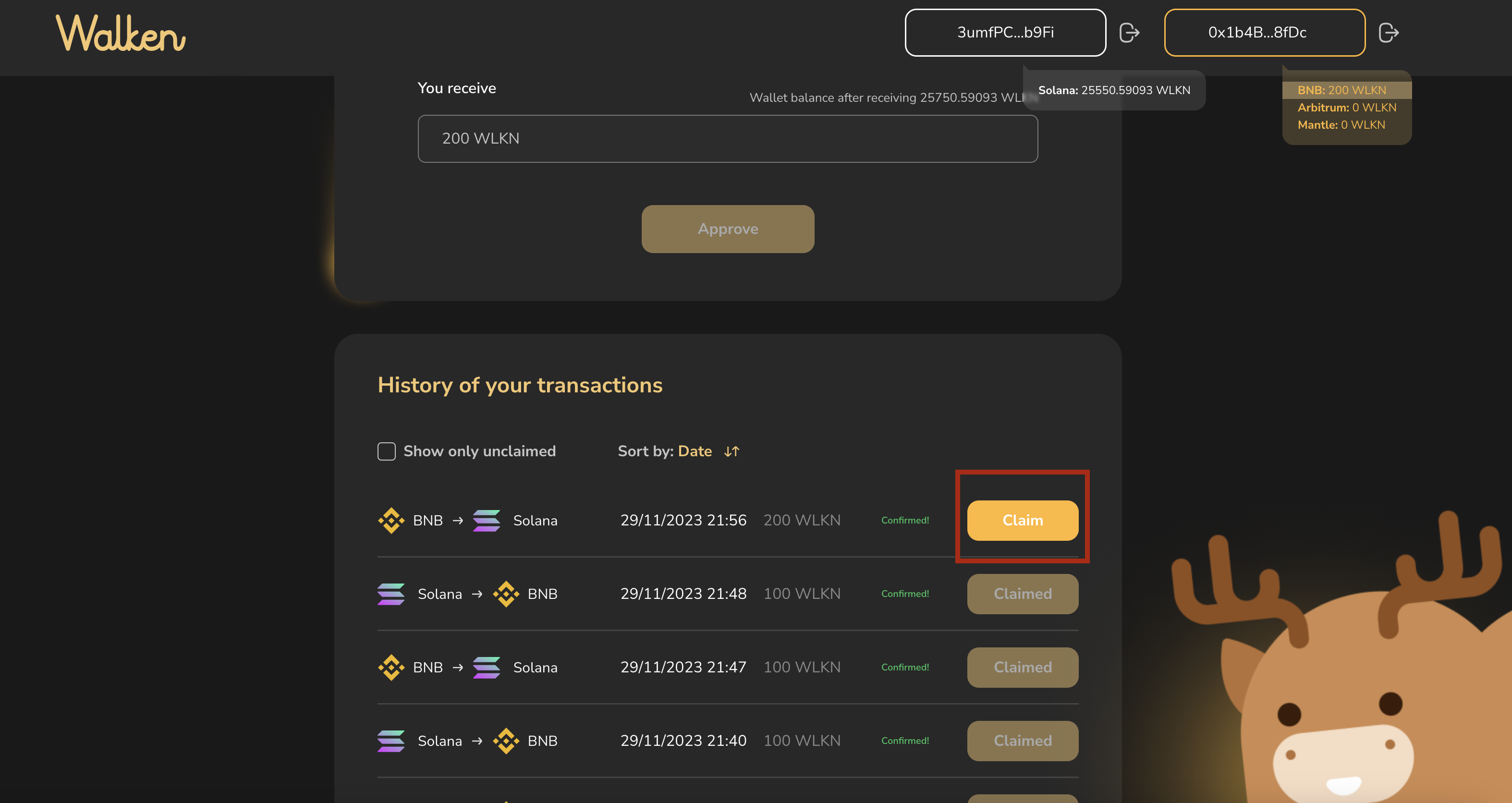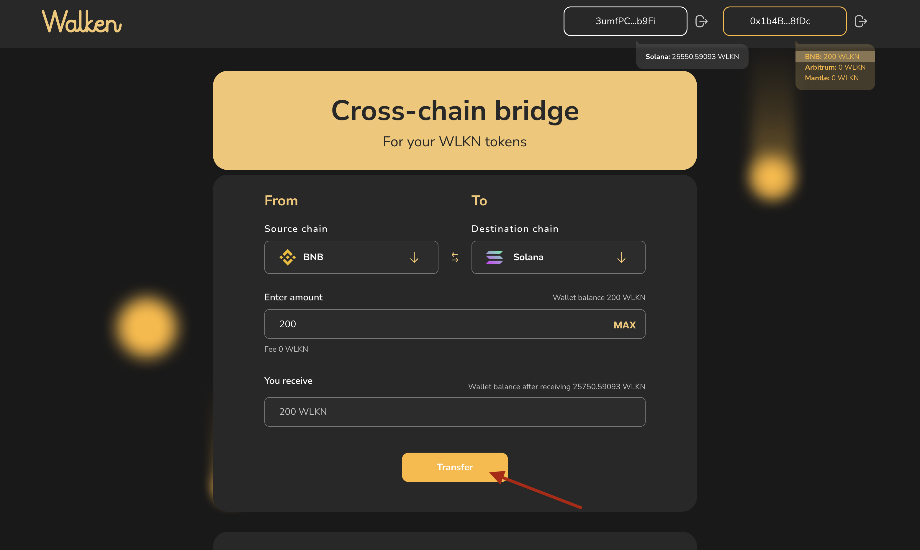 3. **Confirm the transaction**. Please note that Solana takes a fee in SOL (**0.00284 SOL** at the time this article is written) for the transfer. *That’s it, your tokens are* [*successfully sent from Solana to BSC*](https://solscan.io/tx/DGwsszBjNEokxTHNzK2oPHo5yo2hvNPxTjB7tEjvx4B6SKQC9xL6Yp2qBTKbYZoxWkpKP957RnwNha4TtRJT9zU)*, which means you’re no longer having them on Solana (and in the Walken app as well as it only operates on Solana).*