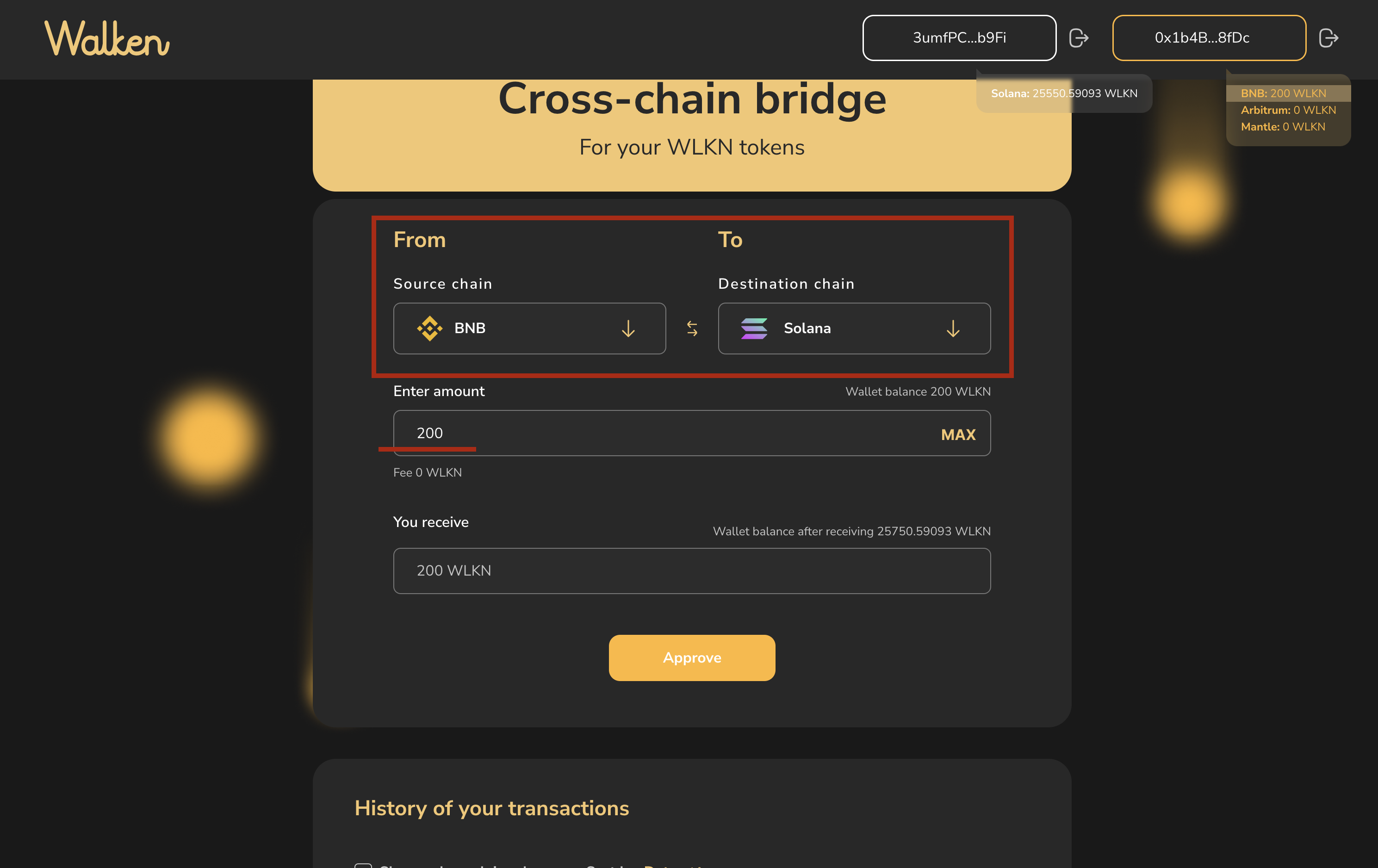When transfering tokens from BSC to Solana, there's **one more step** to complete due to *BSC network operation neunces*. Let's transfer 200 WLKN back from BSC to Solana and break it down.